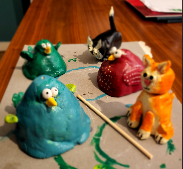 Of course not all artistic endeavours are on canvas. When my daughter returned from travels, she also wanted to join in the fun. Here is our attempt to create animals from air dry clay. Needless to say they have 'nested' in permanent homes around the flat, though I suspect they'll never leave.