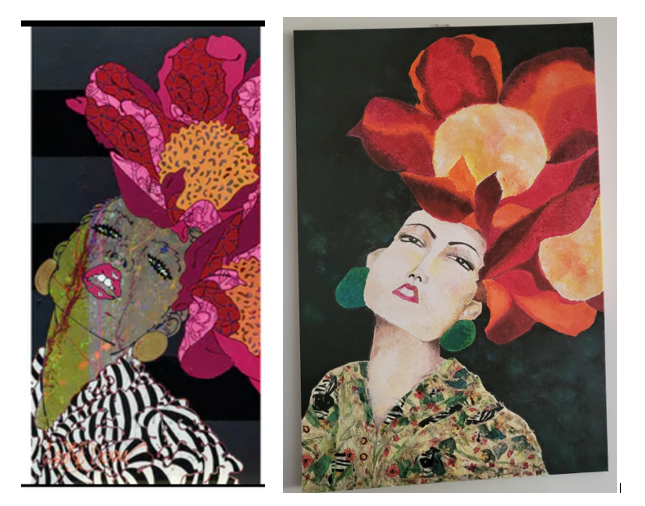 My next experiment was collage. During Covid, I had time to play so using Pinterest for ideas I tried adding paper, fabric and sewing thread onto canvas.
