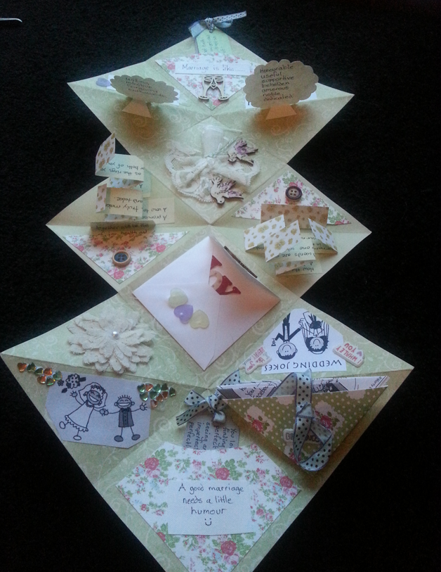 When I visited my sister in Australia, I discovered a whole new world of paper crafts. Australians are big on crafting and there were plenty of shops selling books of patterned papers, templates, tapes and embellishments. I watched a few videos on YouTube and became fascinated with 'squash books'. All cards, for weddings or important birthdays gave me an excuse to create one. They are essentially 3 squares of 6" paper glued overlapping the bottom left hand corner then folded in a way they expand. Pockets and embellishments are added to provide space for pull outs, tags, photos. The options are endless.